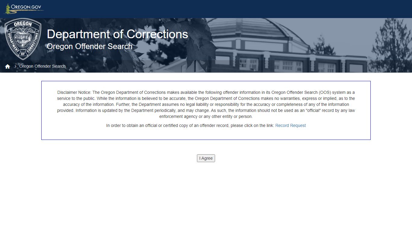 Disclaimer Notice: The Oregon Department of Corrections makes available the following offender information in its Oregon Offender Search (OOS) system as a service to the public. While the information is believed to be accurate, the Oregon Department of Corrections makes no warranties, express or implied, as to the accuracy of the information.